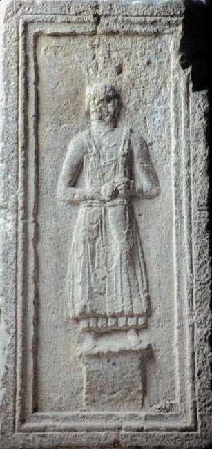 - Auf den gerahmten Nebenseiten auf hohem Podest stehendes Kind: links Knabe in langer Tunica, in den Händen Vogel. Rechts einheimisches Mädchen in Unter- und Obergewand, Gürtel, Flügelfibeln, Halsband mit Lunula, Armbänder, in den Händen Apfel.