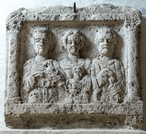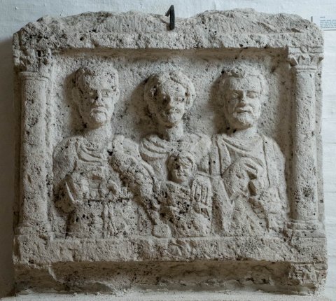 Familie: zwischen Säulen Brustbilder von drei Erwachsenen und einem Kind. Links Mann (Soldat): bärtig, Ärmeltunica, Sagum, Scheibenfibel, Gürtel mit Ringschnalle und Beschlägen. Waffen: in der Linken Schwertgriff. In der Mitte Frau: gewelltes Haar mit Mittelscheitel, Mantel. vor ihr Kind (Mädchen ?).Rechts Mann: bärtig, Ärmeltunica, Sagum, Scheibenfibel, in der Linken Rolle (volumen).