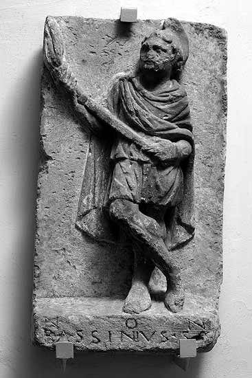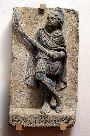 - Mythische Figur (Cautes) : ungerahmte Platte mit vorspringender Standleiste (auf deren Vorderseite die Inschrift). Mit gekreuzten Beinen stehender Cautes in Hosen, kurzer Tunica, Mantel und phrygischer Mütze, hält mit beiden Händen die Fackel.