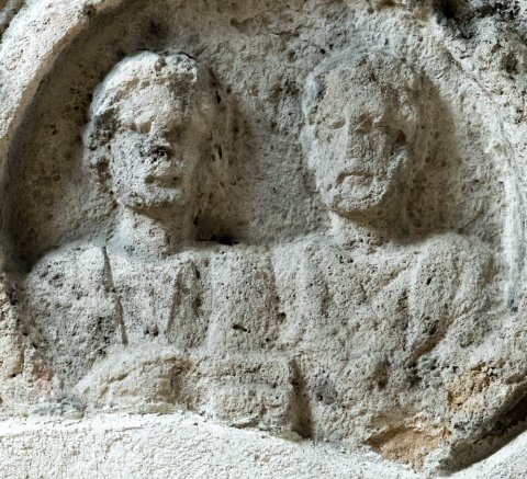 Im Hauptbild auf Pilastern profilierter Bogen, der in den unteren Rahmen des Giebels einschneidet. Darunter großes Medaillon mit zwei Brustbildern (Ehepaar). Links Frau), gewelltes Haar, Tunica, Umhang. Rechts Mann, bärtig, Sagum (?).