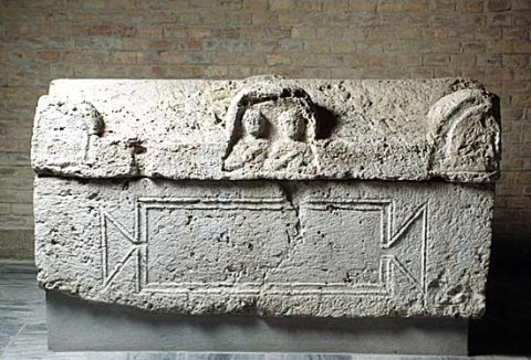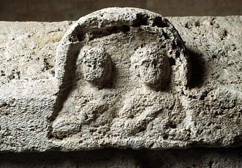 - Dachförmiger Deckel, in der Mitte der Vorderseite am Rand Bogennische mit zwei Büsten (Ehepaar). In den Eckakroteren Profilköpfe mit phrygischer Mütze (Attis ?).