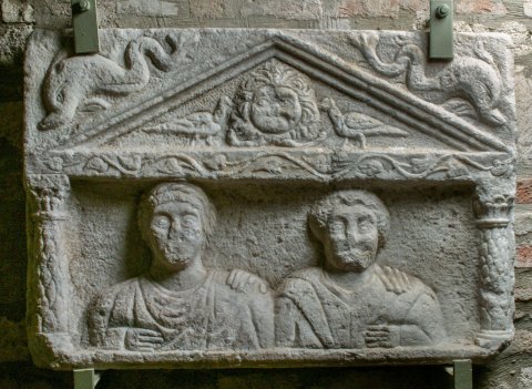 Im Hauptbild zwischen geschuppten Säulen zwei Brustbilder (Ehepaar). Links Frau: Tunica, Mantel. Rechts Mann: bärtig, Locken, Paenula.