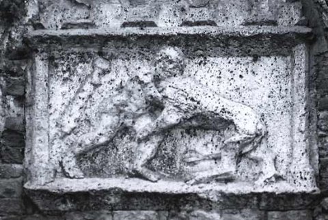 - Mythos : Bildfeld zwischen Säulen. Herakles (Hercules) im Kampf mit dem Löwen. Hinter Herakles hängt die Keule.