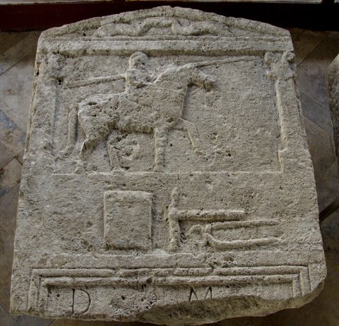 Im Hauptbild zwischen Säulen Reiter (Soldat) mit Lanze nach rechts.