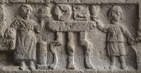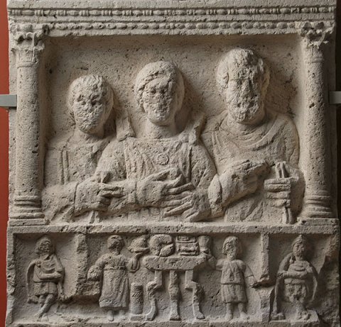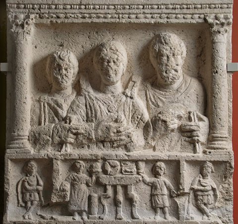 Im Hauptbild zwischen Säulen drei Brustbilder einer Familie. Links Jüngling: bartlos, gewelltes Haar, Ärmeltunica, Sagum, Scheibenfibel, in der Rechten Rolle (volumen). In der Mitte einheimische Frau: Haube, Unter- und Obergewand, Fibeln, auf der Brust Kette mit Medaillon, in der Rechten Frucht. Rechts Mann: bärtig, Locken, Ärmeltunica, Sagum, Fibel, in der Linken Rolle.