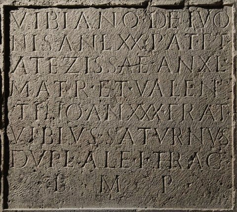 - D(is) M(anibus) // Vibiano Deivo/nis (filio) an(norum) LXX pat(ri) et / Atezissae an(norum) XL / matr(i) et Valen/tino an(norum) XXX frat(ri) / Vibius Saturnus / dupl(icarius) al(a)e I Thrac(um) / b(ene)m(erentibus) p(osuit)
