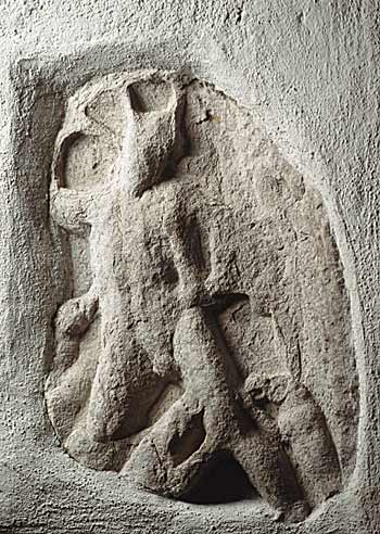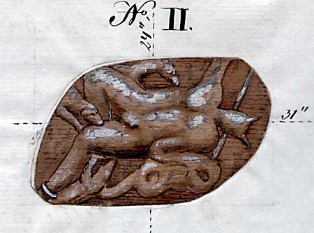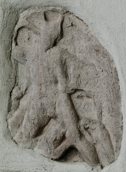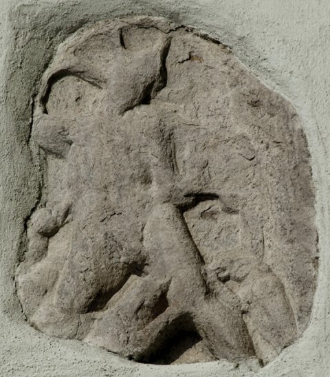 - Mythos (Aktaion): nackte männliche Figur mit Geweih, in der erhobenen Rechten Stock, drei Hunde verbeißen sich in der rechten Hüfte und im linken Bein.