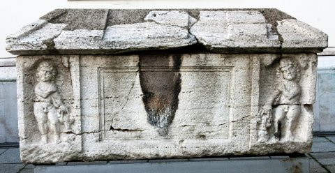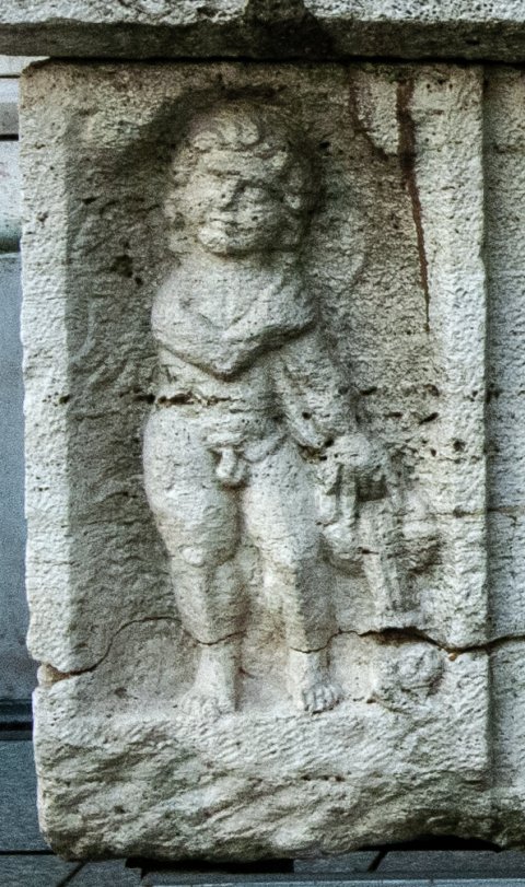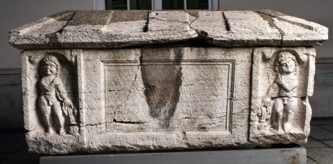 - Gerahmtes Schriftfeld zwischen Bogennischen mit Trauergenius mit gesenkter Fackel. Dachförmiger Deckel.