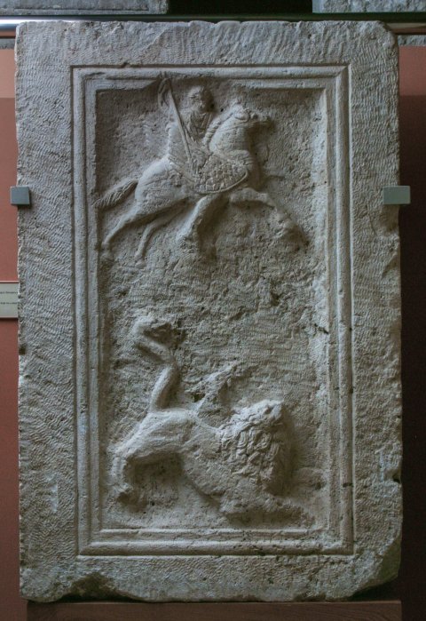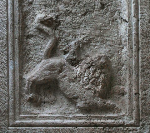 - Mythos : in hochrechteckigem Feld oben Bellerophon mit Lanze auf Pegasos. Unten Chimära mit Löwenkopf, Ziegenkopf auf dem Rücken, Greifenkopf am Schwanzende.