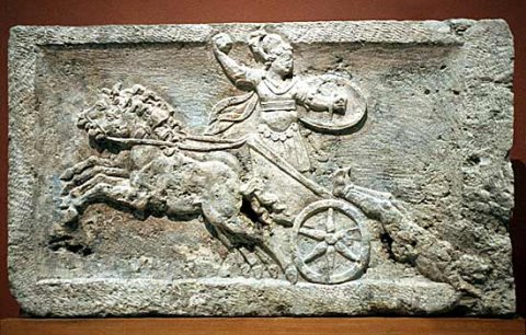 - Mythos (Troja): Hektors Schleifung: Auf Streitwagen mit galoppierendem Zweigespann Achill in Sagum, Panzer mit Pteryges, Offiziersbinde und Helm, die Rechte mit Stein (?) erhoben, in der Linken Schild, an der Hüfte Schwert in Scheide mit Dosenortband. Nackte Leiche des Hektor mit Stricken am Wagenkasten festgebunden.