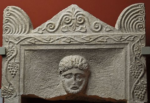 Giebel mit Seitenakroteren, im Feld zwei gegenständige verbundene S-Haken mit Spiralenden, Efeublätter.