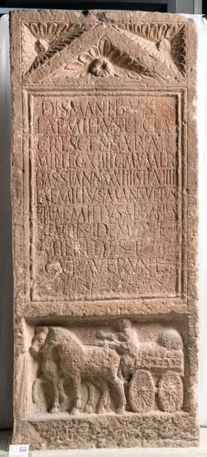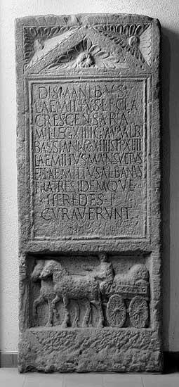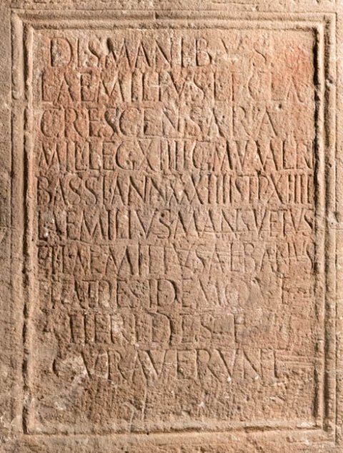 - Dis Manibus / L(ucius) Aemilius L(ucii) f(ilius) Clau(dia) / Crescens Ara / mil(es) leg(ionis) XIIII g(eminae) M(artiae) v(ictricis) (centuria) Valeri(i) / Bassi ann(orum) XXXIIII stip(endiorum) XIIII / L(ucius) Aemilius Mansuetus / et L(ucius) Aemilius Albanus / fratres idemque / heredes f(aciendum) curaverunt