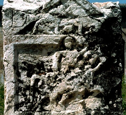 Im Hauptbild Reiter (Soldat) mit Lanze. - Inschrift