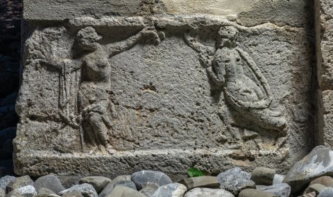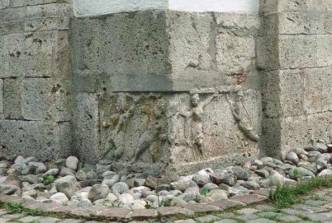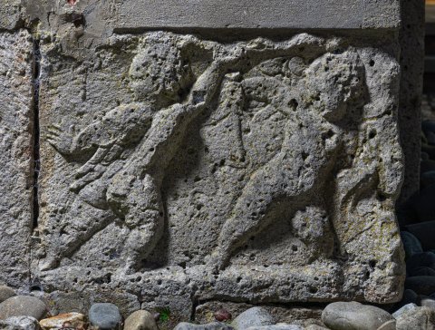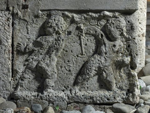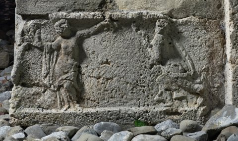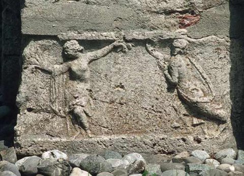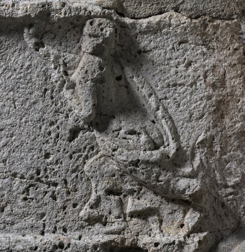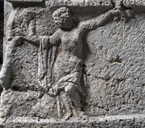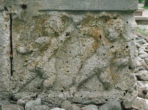 Eckblock: auf der Vorderseite Mythos (Daphne): links stehende Frau, nackt bis auf Mantel über rechter Schulter und Unterkörper, Arme ausgebreitet, Hände zweigförmig. Von rechts laufende, zurückblickende Frau mit entblößtem Körper in Rückenansicht.