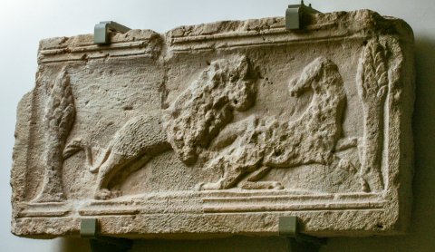 - Tiere : in gerahmtem Rechteckfeld seitlich je ein Baum, nach rechts fliehendes Pferd, von Löwen angesprungen.