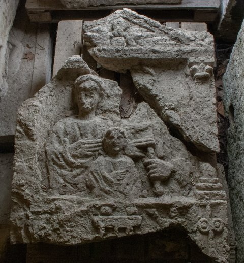 - Gerahmter Giebel mit Blattrosette, Rest eine Eckakroters. Im Hauptbild Familie: zwischen Pilastern Halbfiguren eines Ehepaares mit Kind. Links Frau: aufgestecktes Haar, Tunica, Mantel. Rechts Mann: Ärmeltunica, Sagum, in der Linken Rolle (volumen). Vorn Mädchen: welliges langes Haar, Tunica, Mantel. Zwischenbild mit Totenopfer: Tisch mit Broten, rechts Diener. Auf der rechten Rahmenleiste Beneficiarierlanze ?