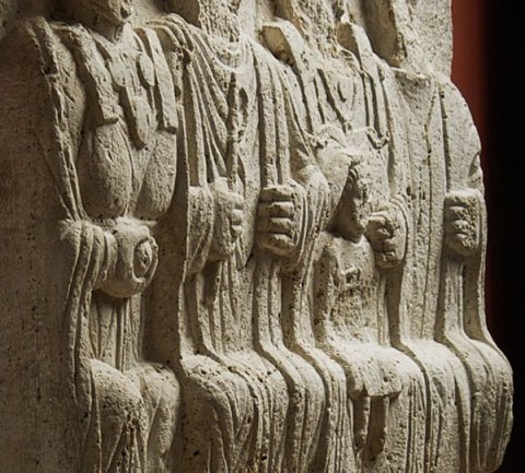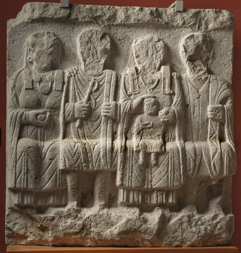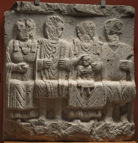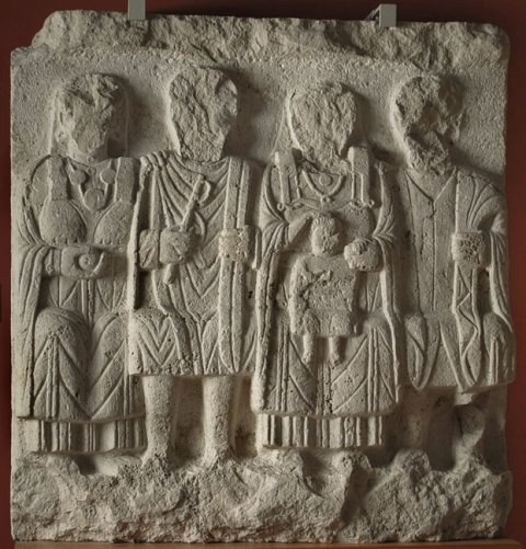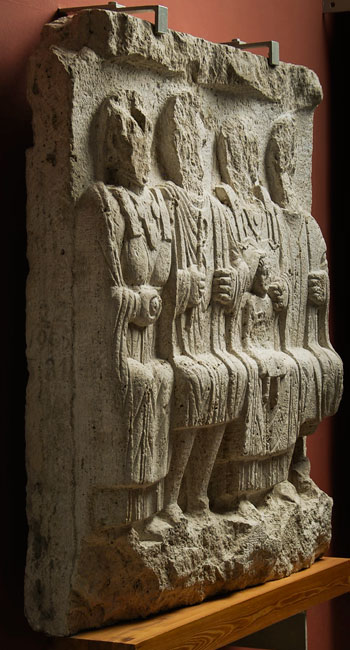 - Rückwand einer Aedicula mit sitzenden Ganzfiguren einer Familie {zwei Ehepaare und ein Kleinkind). Von links: einheimische Frau, Haube, Schleier, Umhang, Ober- und Untergewand, Fibeln, Brustschmuck mit drei Scheiben, Brosche, Halsband, Ohrgehänge, in der Rechten Apfel. Mann, kurze Ärmeltunica, Sagum, Hosen, in der Rechten Peitsche. Einheimische Frau: Haube, Schleier, Umhang, Ober- und Untergewand, Flügelfibeln, Torques mit Anhänger, runde Brosche, auf dem Schoß Kind (Knabe), kurze Tunica, Mantel. Mann: kurze Tunica, Paenula, Hosen, Schuhe.