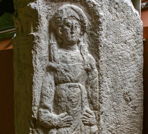 Auf der Innenseite der linken Seitenwange einheimische Frau: Haube, Schleier, Umhang, Ober- und Untergewand, Flügelfibeln, Gürtel, Brosche, Ohrgehänge.