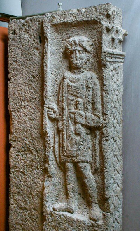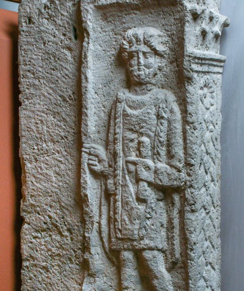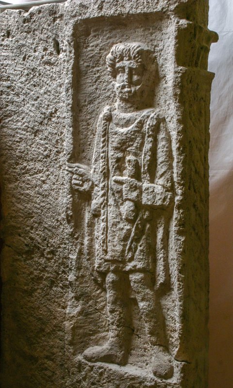Auf der Innenseite der rechten Seitenwange bärtiger Mann, kurze Tunica, Sagum mit Fransen, in der Linken Rolle (volumen).