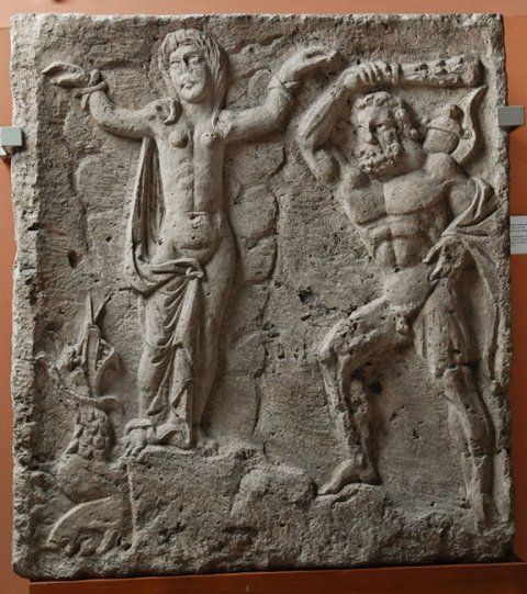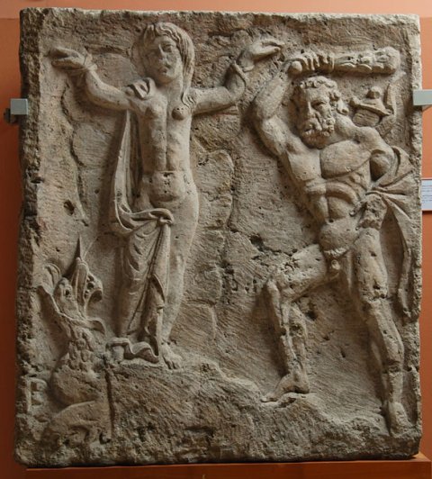 - Mythos : in Rechteckfeld links die an Felsen gefesselte Hesione, neben ihrem rechten Bein Seedrache (Ketos). Rechts Herakles (Hercules), bärtig, nackt, schwingt die Keule über seinem Kopf.
