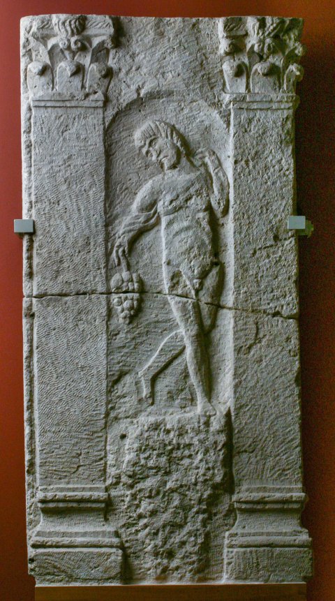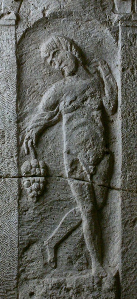 - Auf der Außenseite mythische Figur : zwischen Pilastern Bogennische. Auf hohem Podest tanzender nackter Satyr, in der Rechten Weintraube.