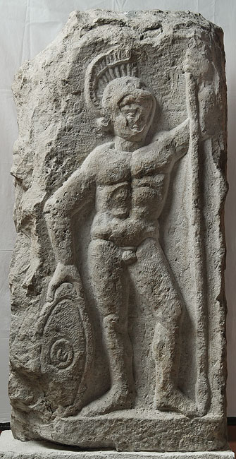 Eckblock: auf der Vorderseite mythische Figur (Mars, Heros ?). Auf niedrigem Podest stehender nackter Jüngling mit Waffen: Helm, in der Linken Lanze, die Rechte auf dem Schild.