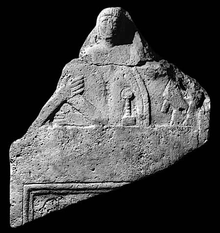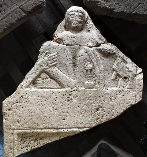 - Im Hauptbild Familie: in oben abgerundeter Nische Brustbilder eines Ehepaares mit Kind. Links einheimische Frau: Haube, die Rechte greift nach der Rechten des Mannes. Rechts Mann: Sagum (?), in der Linken Rolle (volumen) (?) oder Griff, unter der rechten Achsel Dolch (Schwert ?). Zwischen den Eltern oben Büste eines Knaben mit gesträhntem Haar.