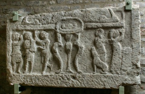 Auf der linken Nebenseite Dienerin in Unter- und Obergewand. Auf der rechten Nebenseite Diener in kurzer Tunica.