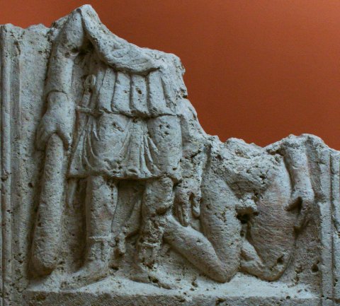 - Mythos (Herakles-Hercules): in Rechteckfeld stehender Herakles in kurzem Gewand und hohen Schuhen, in der Rechten gesenkte Keule. An der rechten Hüfte Schwert. Neben ihm kniender nackter Mann (Kyknos ?).