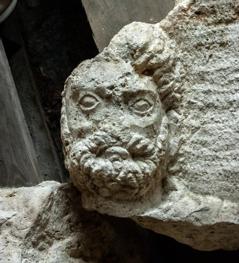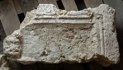 - In profiliert gerahmtem Rechteckfeld links Kopf eines bärtigen Mannes im Mantel. Rechts Umrisse einer zweiten Figur.