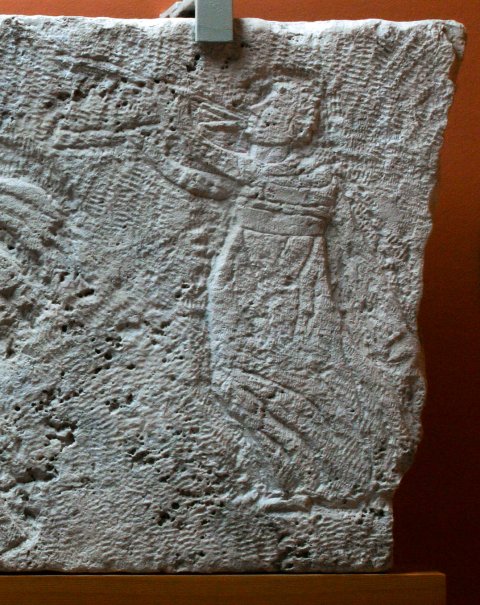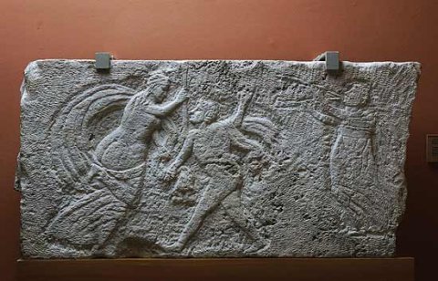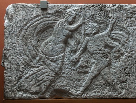 - Mythische Figur, Musikinstrument. Thiasos: Satyr mit Tierfell über dem rechten Arm greift nach tanzender Mänade mit entblößtem Körper, geblähtem Mantel und Thyrsosstab in der Rechten. Rechts Mänade im langen Gewand und Mantel, Doppelflöte spielend.