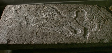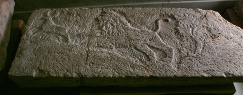 - Tiere: ungerahmtes sehr flaches Relief: Löwe jagt Hirsch, rechts Baum.