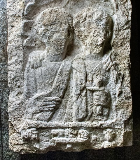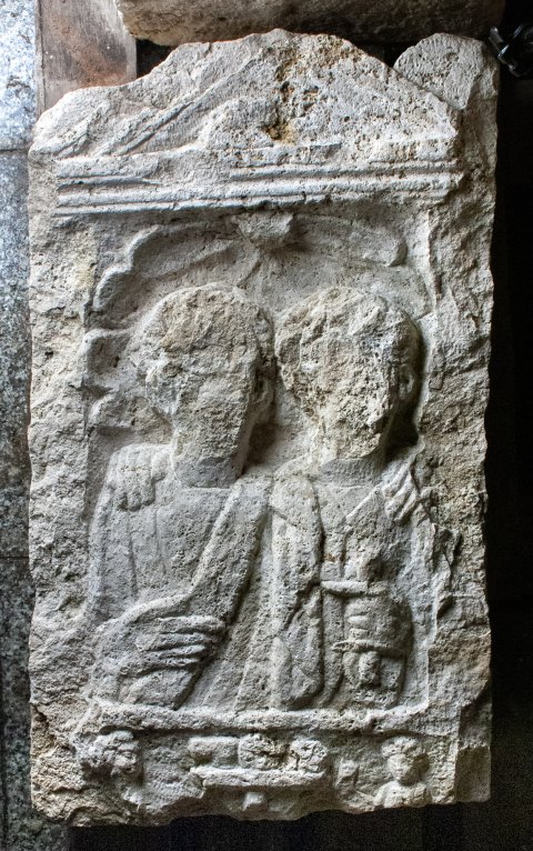 - Giebel mit Seitenakroteren, Relief im Giebelfeld abgeschlagen. Im Hauptbild zwei Brustbilder (Ehepaar) in Muschelnische. Links Frau in Ärmeltunica und Mantel. Rechts Mann in Tunica und Paenula, Rolle (volumen). Zwischenbild mit Totenopfer: Tisch mit Speisen, links Dienerin, rechts Diener.