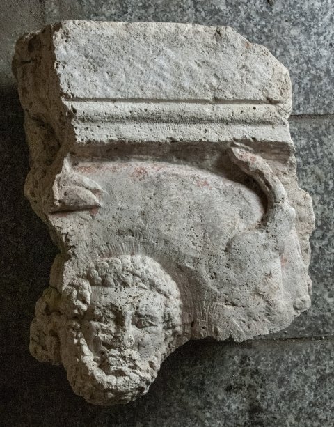 - Mythos : Herakles-Hercules und der Erymanthische Eber (bärtiger Kopf mit Rest des geschulterten Ebers). Oben profilierter Rahmen.