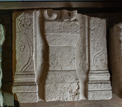 - Linke Aedicula-Seitenwange, auf der Außenseite mythische Figur: zwischen Pilastern mit Ranken hohes Postament mit den gekreuzten Füßen und dem Ende des Pedums einer Attisfigur.