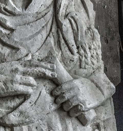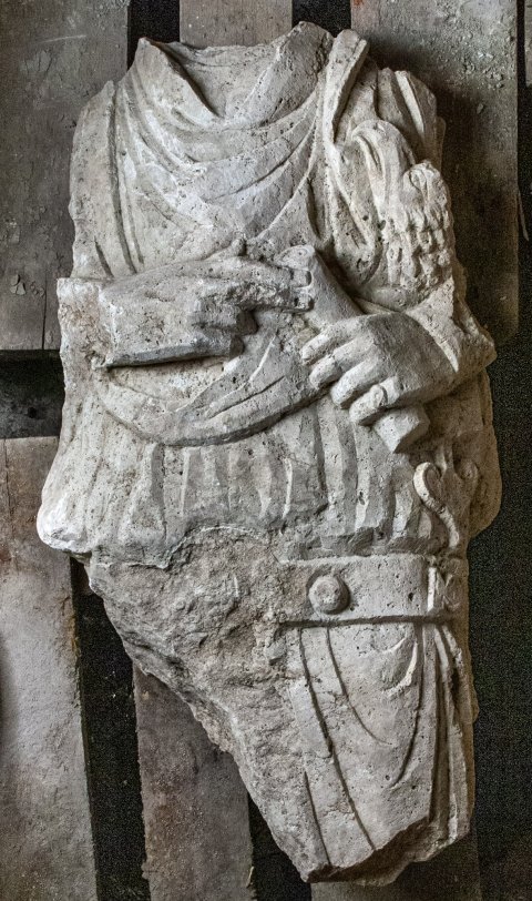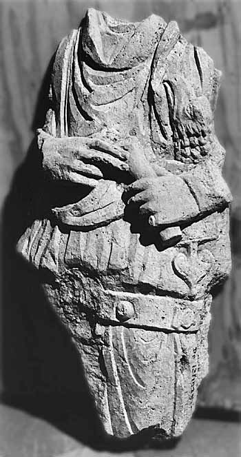 - Mann (Soldat): Tunica, Gürtel mit Ringschnalle und Beschlägen, Sagum, Fingerring, in der Linken Rolle (volumen). Waffen: unter dem linken Arm Schwert mit Adlerkopfgriff.