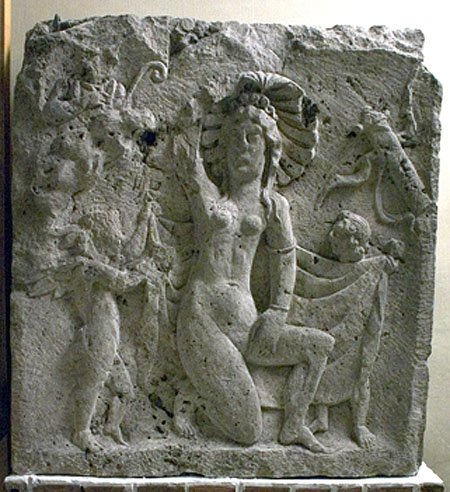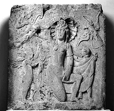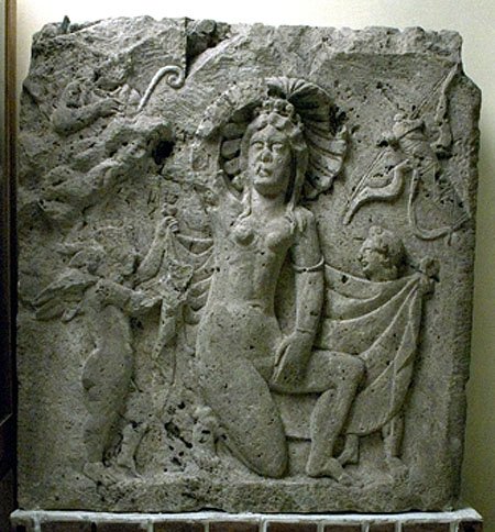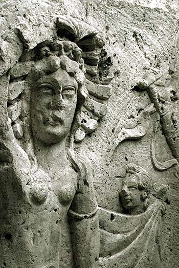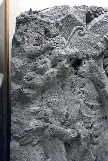 - Mythische Figur, Musikinstrument: kniende nackte Artemis - Diana, den rechten Arm über den Kopf gelegt. Hinter dem Kopf Muschelschale. Zwei kleine Eroten breiten ein Tuch hinter ihrem Rücken aus. Oben Rand einer Felsgrotte, rechts hängen Bogen und Köcher, links hinter Felsen Oberkörper eines Mannes (Aktaion ?) mit Messer (?) in der Rechten und Hirtenstab (Pedum).