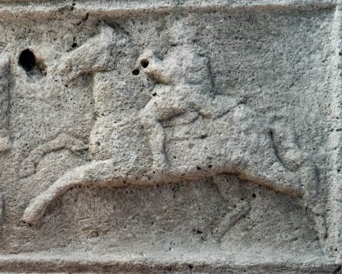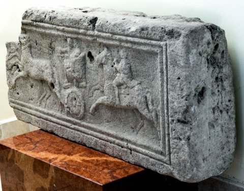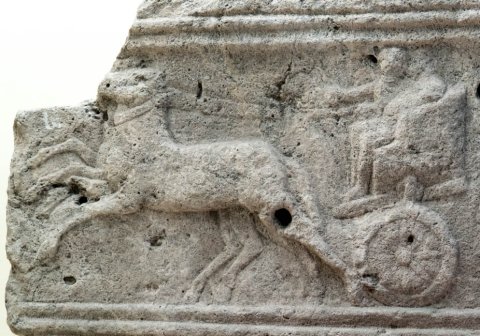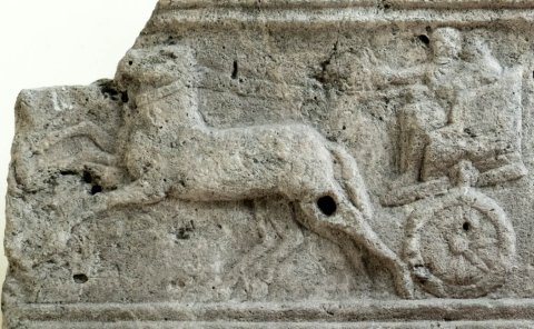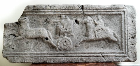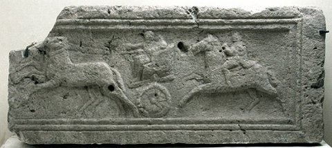 - Wagenszene: in friesartigem Rechteckfeld nach links galoppierendes Zweigespann mit zweirädrigem Wagen in Form eines Lehnsessels, darin zwei Personen. Hinter dem Wagen galoppierender Reiter.
