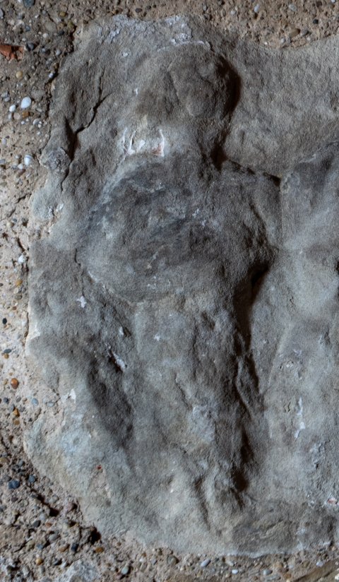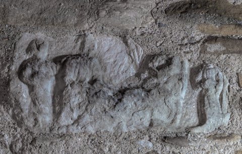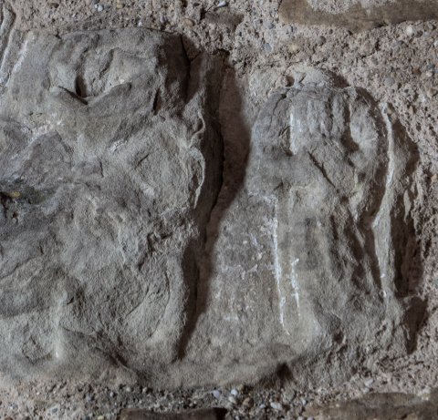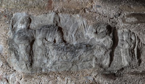 - Fragment einer Grabstele ? Wegen Position im Kirchenmauerwerk nicht abgemessen.