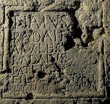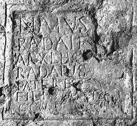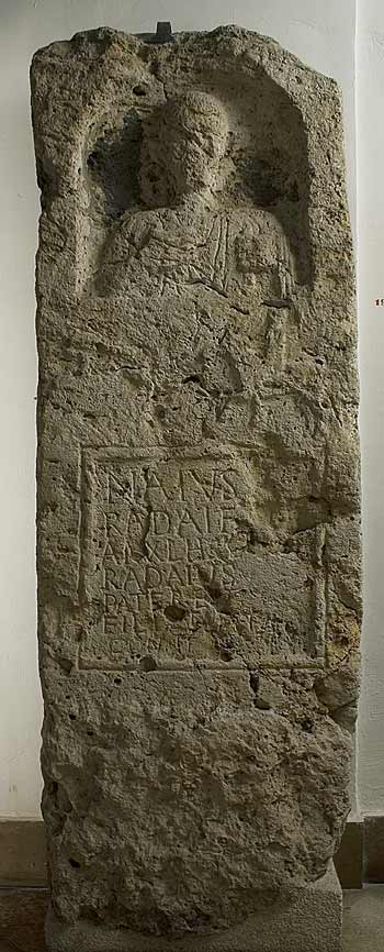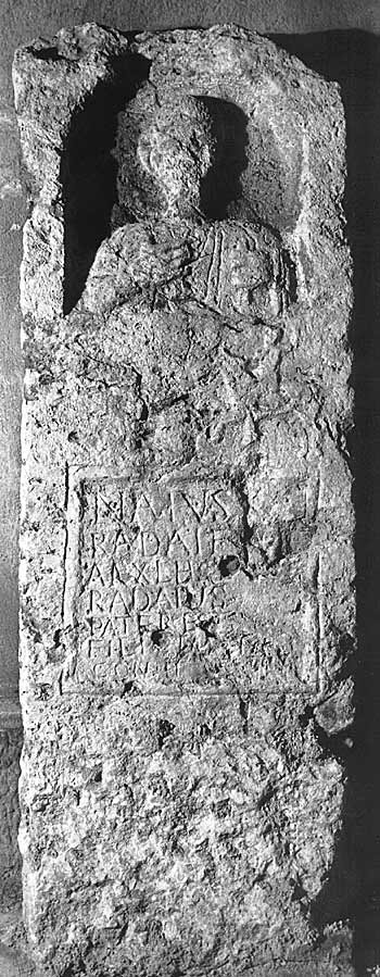 - Naius / Radai f(ilius) / an(norum) XL h(ic) s(itus) e(st) / Radaius / pater et / fili(us) et Nata / con(iux) fe[c(erunt)]