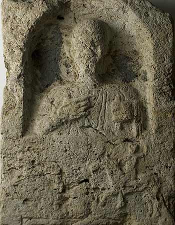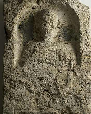 Im Hauptbild in Bogennische Brustbild eines Mannes: bartlos, in der Linken Attribut (?).