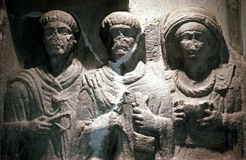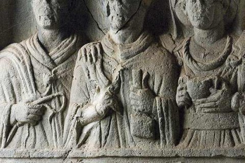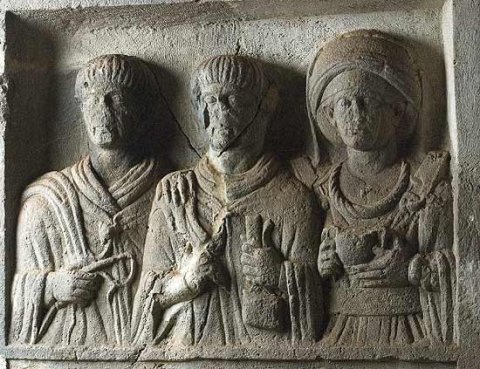 - Eingeschriebener Giebel mit Gorgoneion, auf den Schrägen Delphine. Im Hauptbild Halbfiguren einer Familie. Links Mann: bartlos, trajanische Frisur, Ärmeltunica, Paenula, Fibel, Halstuch, in der Rechten Peitsche. In der Mitte Mann: bartlos, trajanische Frisur, Ärmeltunica, Paenula, Halstuch, Fingerring, in der Linken Rolle (volumen) und zusammengeklappte Schreibtafel, in der Rechten Stilus. Rechts einheimische Frau: Haube, Schleier, Fibeln, Gürtel, Torques, Armband, in den Händen Henkelbecher. Im Zwischenbild Jagdszene mit Reiter.