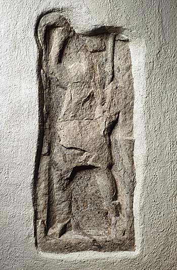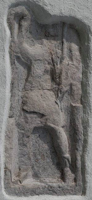 - Ausschreitender Mann in Schuhen, kurzer Tunica und Mantel, im linken Arm Stab, rechter Arm erhoben.