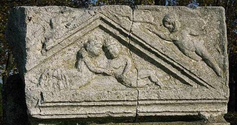 - Im Giebelfeld Mythos (Venus und Adonis): gelagertes nacktes Paar, Oberkörper zueinandergewendet. Auf den Schrägen fliegende Genien und Delphine.