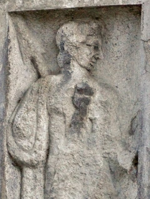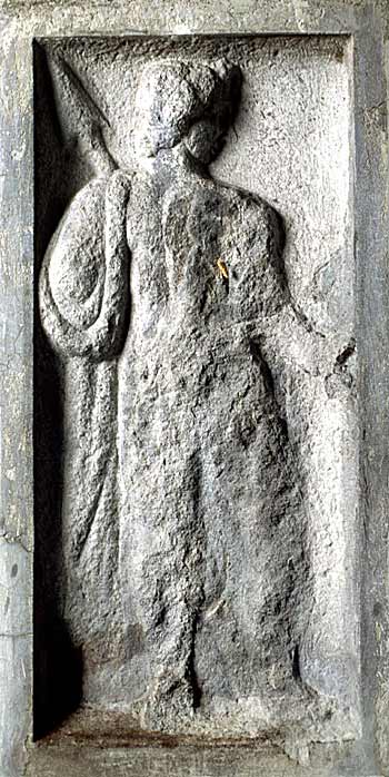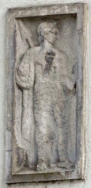 - Mythische Figur (Mars ?, Heros ?): stehender nackter Jüngling in Rückenansicht, lange, verknotete Locken, Mantel über der linken Schulter, Lanze.