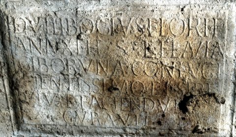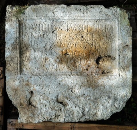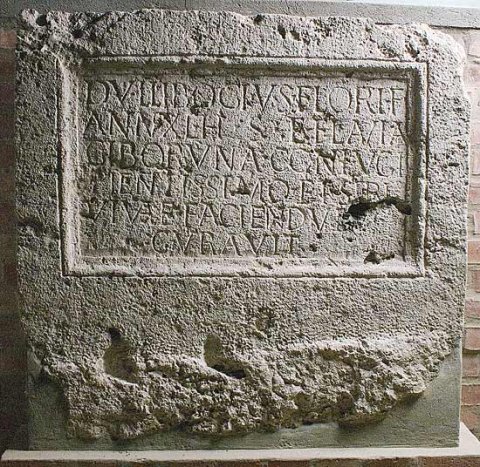 - Dullibogius Flori f(ilius) / ann(orum) XL h(ic) s(itus) e(st) Flavia / Giboruna coniugi / pientissimo et sibi / vivae faciendum / curavit