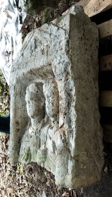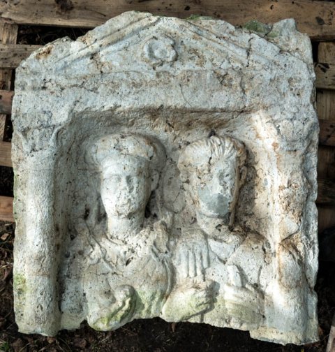 Im Hauptbild zwischen Säulen zwei Brustbilder (Ehepaar). Links einheimische Frau: Haube, Schleier, Ober- und Untergewand mit Brosche, Flügelfibeln, Torques mit Lunula, in der Rechten Früchte. Rechts Mann: bartlos, gesträhntes Haar, Paenula, Fingerring, in beiden Händen Gegenstand (Peitsche ?).