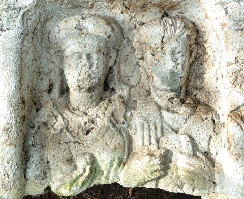 - Bartloser Mann, trajanische Frisur, einheim. Frauentracht (Flügelfibel, Haube, Torques mit Lunula)