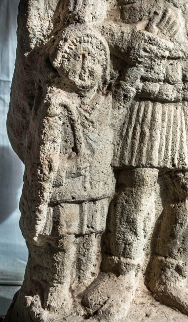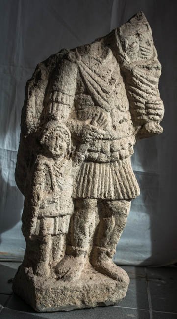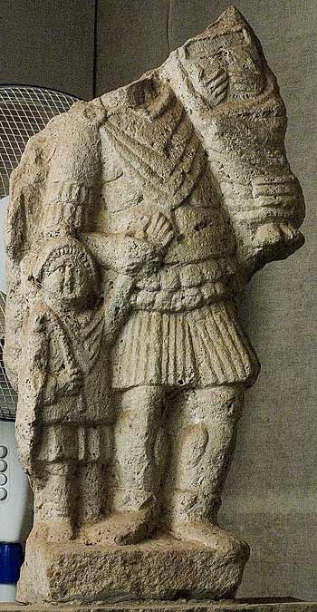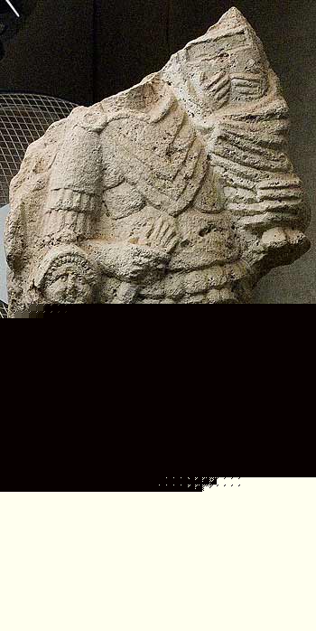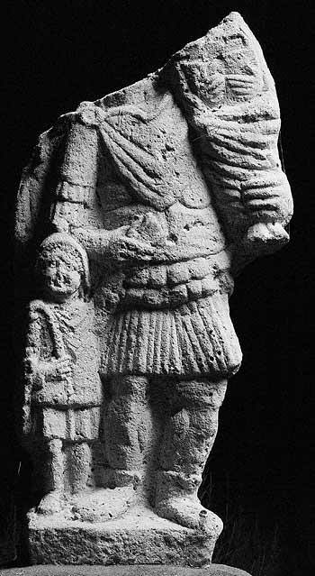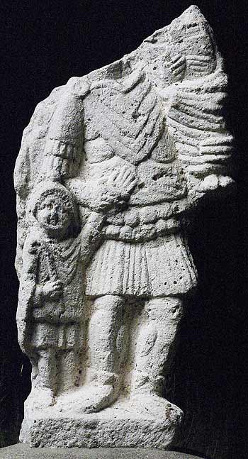 - Mythos (Troja): Aeneas mit Panzer, Mantel und Schuhen, Anchises auf der linken Schulter, Askanius an der rechten Hand.