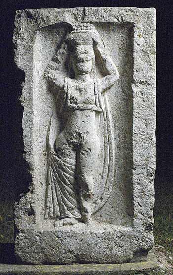 - Mythische Figur (Jahreszeit ?): Eingetieftes Rechteckfeld. Frau mit entblößtem Unterkörper, Mantel über Schultern und Rücken, hält mit beiden Händen Korb mit Früchten auf dem Kopf.